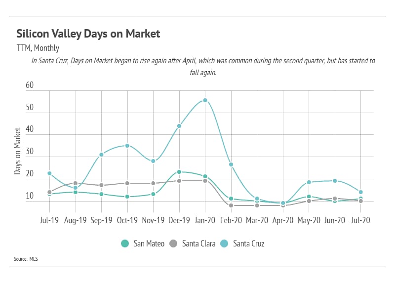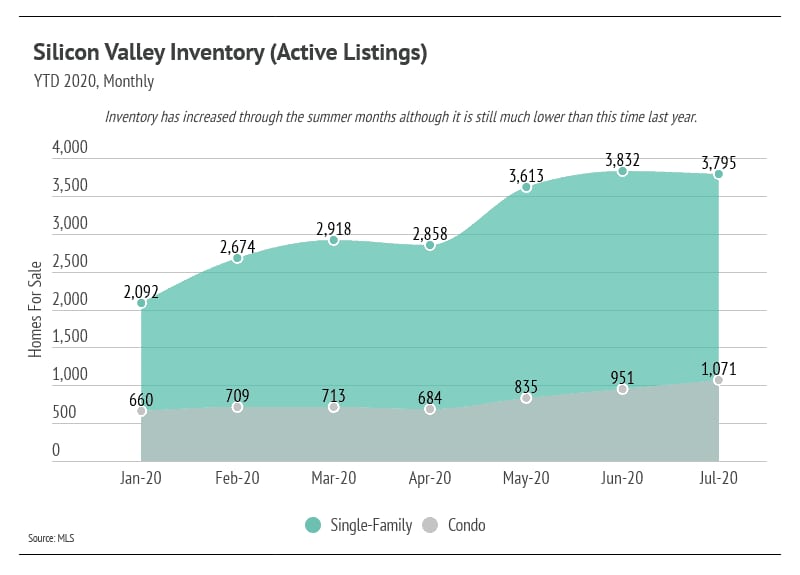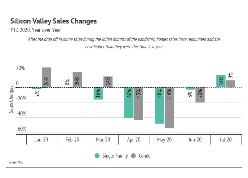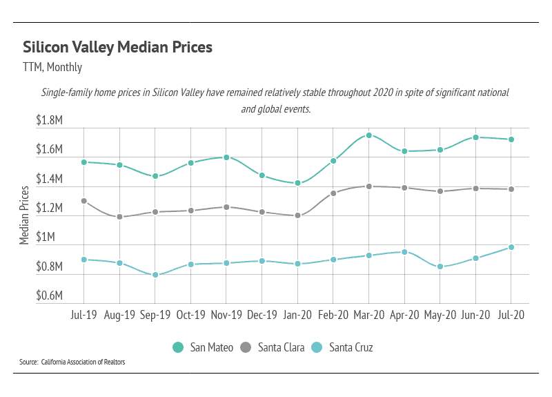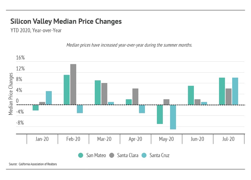 Key Topics and Trends in September The pandemic tested the efficacy of large-scale remote work, causing companies to reconsider the need for massive office spaces. Notably, Pinterest announced in late August 2020 that it paid $89.5 million to terminate its lease on a yet-to-be-built 490,000 square foot office space. The choice reflects Pinterest’s reevaluation of its workforce needs, and its realization that more employees can work from home on a regular basis. Pinterest is showing another “new normal” for companies: hiring employees from different parts of the country without requiring those employees to relocate near the office. As a result, companies and employees are even less restricted by geographic location than they ever have been in the past. SFGate reports that the Bay Area is not going through an abnormal population exodus; rather, the area simply is not seeing the usually high number of people moving to the area. Although fewer people moving to the Bay Area sounds like it would lower the demand for homes and, therefore, decrease home prices, the median home price has actually remained stable through August. In order to explain why prices have not changed, we can look to affordability. According to the California Association of Realtors, a median homeowner needs to earn a minimum income of around $300,000 and be able to pay $7,000 per month for mortgage, taxes, and insurance. This monthly expense is more than twice the average renter, who now pays less than $3,000 per month. Unlike many other counties around the country where the cost of a mortgage is similar to the cost of rent, Silicon Valley maintains a large gap between those that can afford rent versus those that can afford a mortgage. The rental market, which is receiving a lot of press for its steep decline, does not foreshadow a decline in single-family home prices. September Housing Market Updates for Silicon Valley A note on the data: We utilize data from the California Association of Realtors®, which provides an incredibly rich data set. In an effort to bring you these reports in a timely manner, for the month of September, we are using July’s numbers to analyze market trends over the first half of the year. Single-family home prices climbed back to the highest median price on record as inventory waned and sales increased. The condo market saw an increase in median prices as well. Year-over-year, single-family home prices are up 10% in San Mateo and Santa Cruz and up 6% in Santa Clara. Silicon Valley as a whole has fared well throughout the pandemic with year-over-year prices dipping briefly in May and rebounding in the summer months. Median condo prices posted gains across counties. Santa Cruz saw significant price increases for both single-family homes and condos. The inventory of homes for sale remains near its high for the year but are far lower than last summer, which we can see reflected in the increased median home prices. Lack of supply compared to demand typically buoys the Silicon Valley’s prices, which still remains true. Demand has remained high in the summer months, and the area may see an increase in new listings as sellers look to capitalize on the favorable seller’s market. To fully appreciate the year-over-year decline in inventory, we must look at the ways in which sales behaved in 2020. During the initial months of the pandemic (March, April, and May), buyers and sellers hesitated to enter the market or entirely withdrew from it. Sellers began to reenter the market in May, thereby increasing inventory, but not to last year’s levels. Without the usual inventory, buyers have had fewer options from which to choose, and yet, sales have rebounded, surpassing last year’s numbers. We’ve seen a large year-over-year sales increase, which is an amazing recovery from the lows in May. The increase in sales shows that there is still high demand in the area, despite the lower-than-usual inventory.